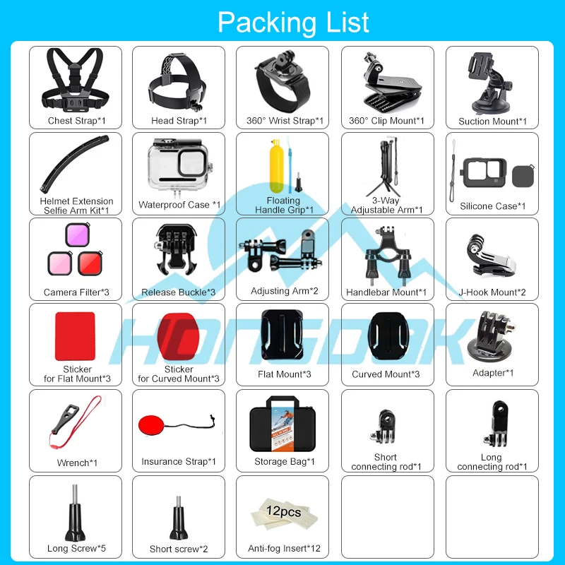 HONGDAK 61 in 1 Universal Action Camera Accessories Kit for Action Camera Models for GoPro Hero 13 12 11 10 9 Insta360 DJI Osmo